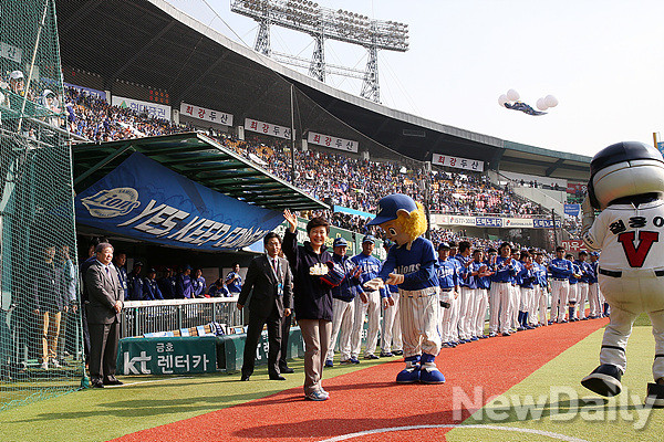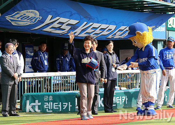 사진은 박 대통령이 시구를 위해 삼성 덕아웃을 나서는 모습.