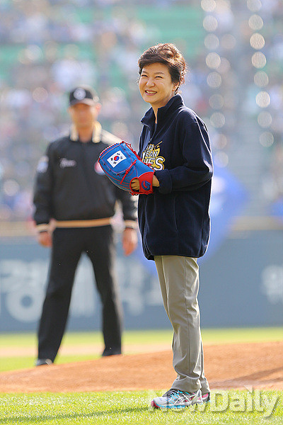 박근혜 대통령이 27일 오후 잠실야구장에서 열린 두산과 삼성의 코리안시리즈 3차전에 앞서 시구를 준비하고 있다.