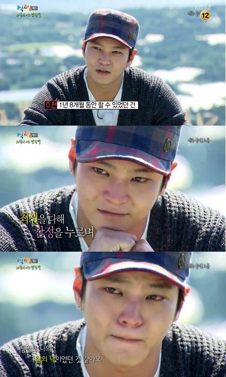 배우 주원이 <1박2일> 하차 소감을 밝히며 눈물을 펑펑 쏟았다.27일 방송된 KBS 2TV <해피선데이-1박2일>(이하 1박2일)에서는 제주도에서 주원과 함께 하는 마지막 여행이 그려졌다.