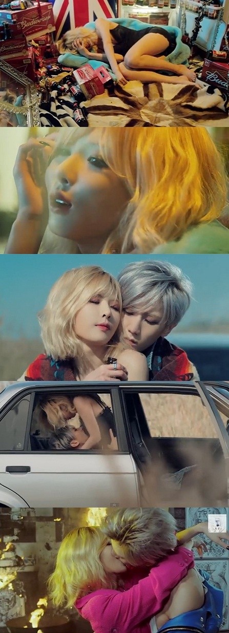 [내일은 없어] 뮤비에서 장현승과 현아는 1930년대 실존했던 남녀 2인조 강도 [보니 앤 클라이드]를 모티브로 일상에서 도피한 젊은이들의 느낌을 연출했다. 특히, 현아와 장현승은 도발적인 베드신과 키스신으로 한층 무르익은 성숙한 매력을 과시했다.