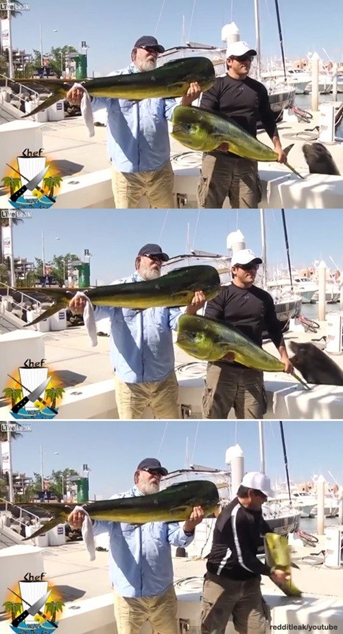 공개된 영상은 멕시코 바하칼리포르니아주의 한 항구에서 촬영된 것으로 두 명의 낚시꾼이 커다란 물고기를 들고 기념촬영을 하고 있다. 그런데 이들 뒤에 갑자기 바다사자가 나타나 남성 한 명이 들고 있는 물고기를 잽싸게 낚아채 놀라움을 자아낸다.