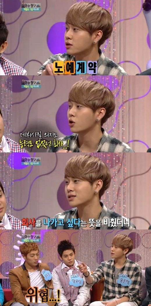 용준형은 작년 2월 KBS2 <승승장구>에 출연해 “10년짜리 노예 계약을 했다. 소속사에서 약속을 안지키고 방송도 할 수 없는 여건이었다. 내가 그만하고 싶다는 뉘앙스를 사장님에게 내비쳤더니 나중에 나를 술집으로 불러 갑자기 술병을 깨고 진짜 나갈 거냐고 위협했다. 어린 나이에 죽을 수 있겠다는 생각이 들어 숙소를 빠져나왔다”고 털어놨다.