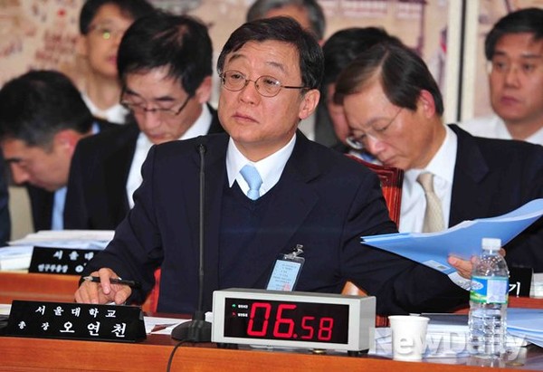 <오연천> 서울대학교 총장이 28일 여의도 국회에서 열린 [교육문화체육관광위] 국정감사에서 의원들의 질의를 듣고 있다.