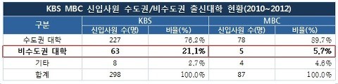 수도권 대학 출신이 227명으로 76.2%이었다.비수도권 대학 출신 신입사원은 63명으로 21.1%를 차지했다.반면 지난 2010년부터 작년까지 MBC가 채용한 신입사원은