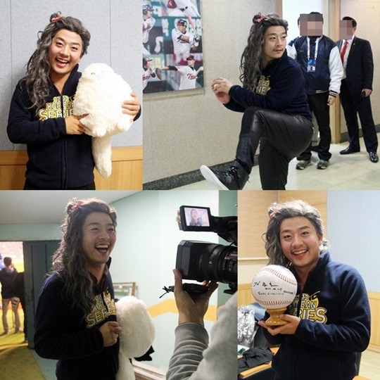 사진 속 김준호는 긴 머리와 롱드레스 등 [뿜엔터테인먼트]의 중년 여배우 사귀자 캐릭터 분장을 그대로 하고 한국시리즈 공식 점퍼로 시구패션을 완성했다. 또한, 드디어 성사된 시구가 설레는(?) 듯 살짝 들떠 보이는 모습이 웃음을 자아낸다.
