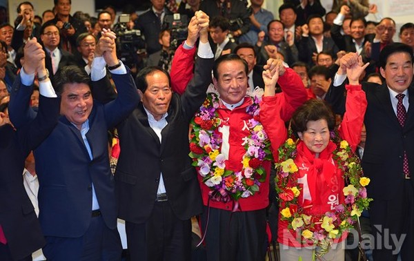 [10·30국회의원 재보궐선거] 경기 화성갑에 출마한 새누리당 서청원 후보가 30일 화성시 봉당읍에 마련된 선거사무실에서 당선이 확실시 되자 기뻐하고 있다.