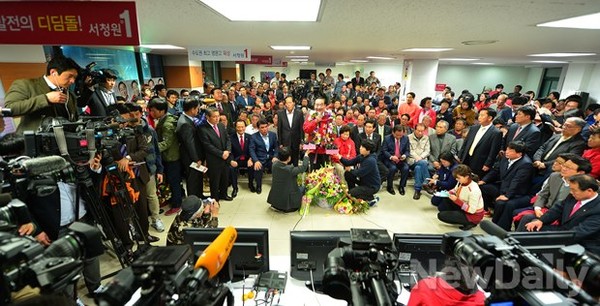 [10·30국회의원 재보궐선거] 경기 화성갑에 출마한 새누리당 서청원 후보가 30일 화성시 봉당읍에 마련된 선거사무실에서 당선이 확실시 되자 당선소감을 밝히고있다.