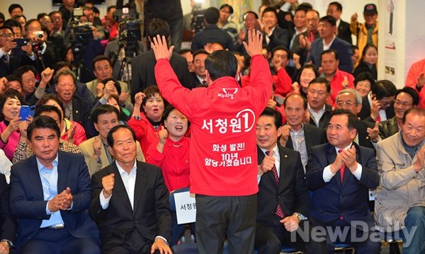 [10·30국회의원 재보궐선거] 경기 화성갑에 출마한 새누리당 [서청원] 후보가 30일 화성시 봉당읍에 마련된 선거사무실에모인 지지자들에게 화답하고 있다.