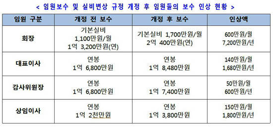 비상임 회장에겐 1억 3,200만원에서 7,200만원이 인상된