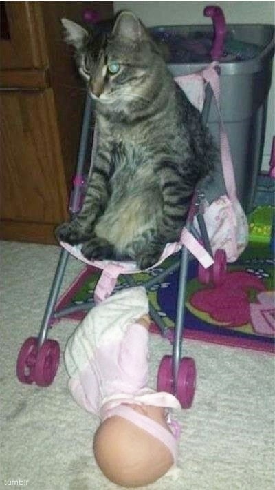 게재된 사진에는 유모차에 앉고 있는 고양이 한 마리의 모습이 담겨 있다. 이는 유모차 아래에는 이기 인형이 쓰러져 있는 걸로 보아 고양이가 인형을 밀어내고 유모차를 차지한 것으로 보인다.
