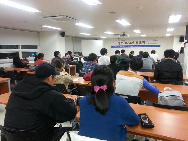 2013.11.1 △ 대학생들이 토론회에 참석해 열띤 토론을 벌이고 있다. 전국대학생북한인권협의회에 소속된 단체는 <북한인권학생연대>, <전북대학교 북극성>, <고려대학교 35호실>, <선문대학교 북한우리>, <성신여대 북한우리(가)> 등이다. ⓒ 전국대학생북한인권협의회 제공