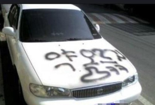 공개된 사진에는 불법 주차된 자동차에 누군가가 검은색 스프레이로 “약 오르지ㅗㅋㅋ”라는 글씨가 크게 낙서된 모습이 담겨 있다.