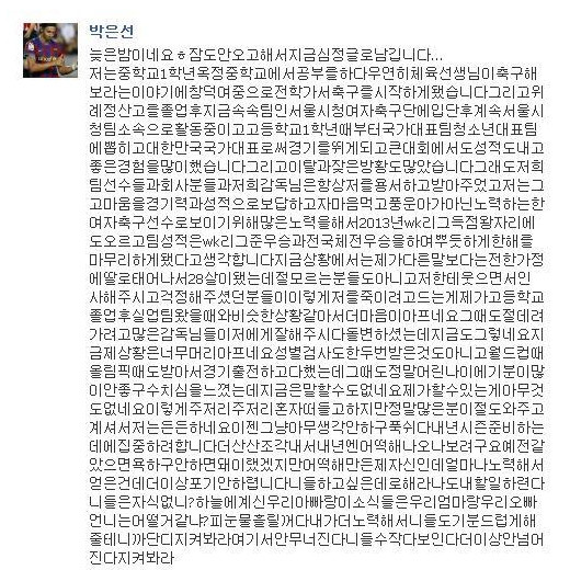 박은선은 “한 가정의 딸로 태어나 28살이 됐는데 절 모르는 분들도 아니고 저한테 웃으면서 인사해주시고 걱정해주셨던 분들이 이렇게 저를 죽이려고 드는 게 제가 고등학교 졸업 후 실업팀 왔을때와 비슷한 상황 같아서 더 마음이 아프다”고 털어놨다.