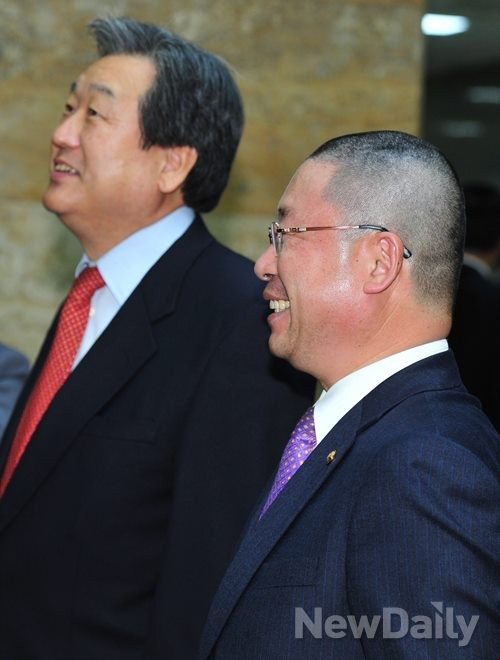 정당 해산청구에 반발해 삭발한 통합진보당 <오병윤> 원내대표가 7일 오전 서울 여의도 국회에서 열린 국토교통위원회 전체회의가 끝나고엘리베이터 앞에서새누리당 <김무성> 의원과 대화를 나누고 있다.