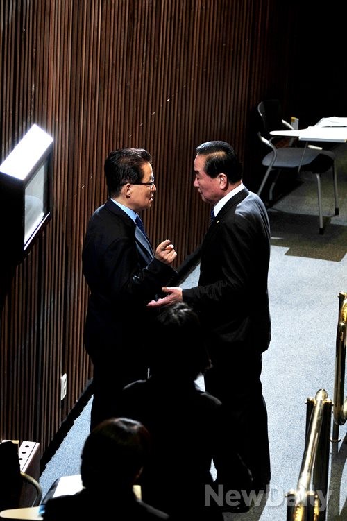 지난 10.30 재보궐선거 당선자인 새누리당 <서청원> 의원이 15일 오후 여의도 국회 본회의에 참석해 민주당 <박지원> 의원과 이야기를 나누고 있다.