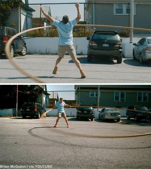 공개된 영상에는 직경 5미터가 넘는 훌라후프를 거뜬히 돌리고 있는 한 남자의 모습이 담겨 있다.