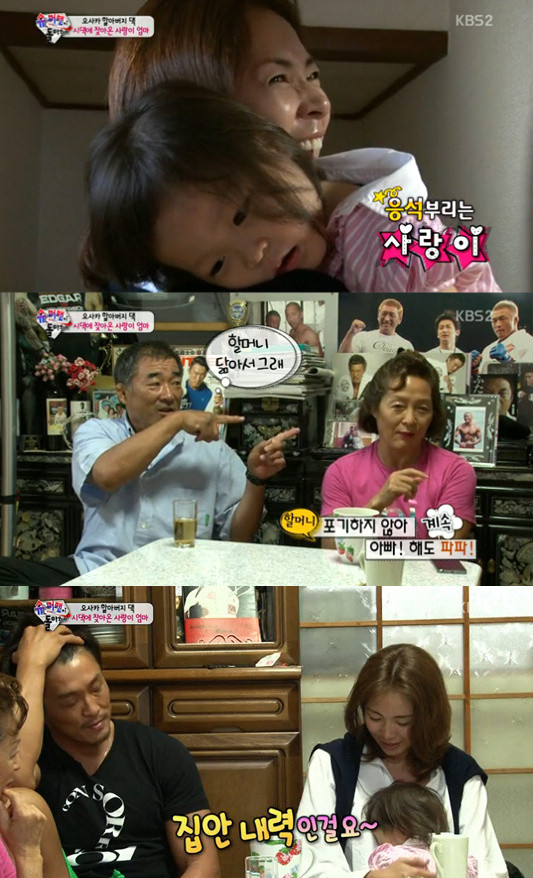 이날 야노시호의 등장에 딸 추사랑은 자리에서 벌떡 일어나 물개박수를 치며 엄마를 반겼다. 이어 엄마 품에 안겨 어리광을 부렸고, 이를 본 아빠 추성훈과 할아버지 추계이 씨는 서운함을 감추지 못했다.