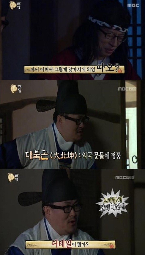 무한도전에서 데프콘이 대북곤으로 변신해 큰 웃음을 선사했다.지난 16일 방송된 MBC '무한도전'에서는 '관상-왕게임' 편이 그려진 가운데 데프콘이 '대북곤' 역을 맡아 게스트로 출연했다.이날 방송에서 '무한도전' 멤버들은 지난주 각자 정해진 조선시대 신분에 따라 높은 신분을 차지하기 위해 고군분투하는 모습이 그려졌다.특히 유재석이 하하의 계략에 빠져 '선비'에서 '망나니'로 강등하자 대북곤으로 변신한 데프콘을 찾았고 그에게 타임머신을 제안받았다. 대북곤이란 조선시대 때 외국 문물에 정통한 인물을 이르는 명칭이다.이날 데프콘은 어색한 사극톤과 연기력을 선보였고, 이에 유재석은 "사극을 해본적이 있어야지"라고 핀잔을 줘 웃음을 자아냈다.또한 데프콘은 사극임에도 '디테일'이라는 영어단어를 썼고 이어 "브래들리가 알려줬다"고 재치있게 위기를 모면해 웃음을 선사했다.이어 유재석은 "버스커버스커를 말하는게냐"고 물었고 데프콘은 "버섯 키워서 누가 버섯 먹나?"라고 애드리브를 날려 주변을 초토화시켰다.한편, 데프콘 대북곤 변신 소식에 "아 데프콘 어색한 모습도 웃겼다" "데프콘 무도 반고정?" "아 데프콘 진짜 물올랐다" "사극은 어려운듯" "오랜만에 재밌었다" 등의 반응을 보였다.[사진 출처=MBC 무한도전 방송화면 캡처]