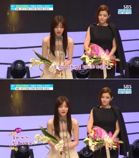 이유비는 수상소감으로 선배들에게 감사인사를 전했고, 이어 "엄마, 아빠 저 때문에 속 많이 상하셨을 텐데.."라며 눈물을 글썽였다. 이에 MC를 맡은 티아라 소연이 "유비 씨가 참 효녀네요"라고 말해 눈길을 끌었다.
