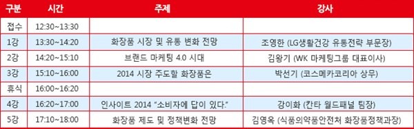 특히 이번 세미나에서는▲조영한(LG생활건강 유통전략 부문장),▲김왕기(WK 마케팅그룹 대표이사),▲박선기(코스메카코리아 상무),▲강이화(칸타 월드패널 팀장),▲김영옥(식품의약품안전처 화장품정책과장) 등분야별 전문가들을 통해보다 실질적이면서도 풍부한 기술과 경험을