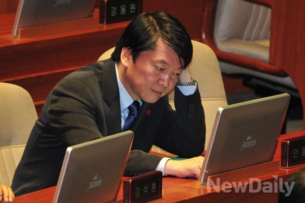 <안철수> 무소속 의원이 21일 오전 국회(정기회) 본회의가 열린 여의도 국회 본회의장에서 모니터를 보고 있다.