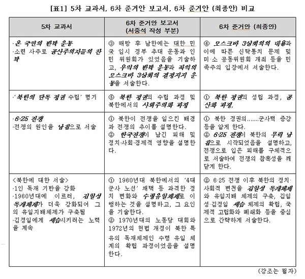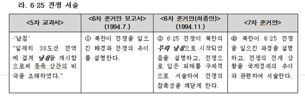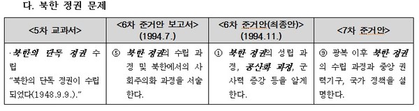 <7차 준거안> 집필자들은 남한에 대해서는 ‘단정노선(=단독정부노선)’, ‘남한 단독선거’ 등의 표현을 서슴지 않으면서, 북한 정권에 대해서는 ‘단독’이라는 단어를 뺐다. <6차 준거안>의 ‘공산화’라는 단어 역시 뺐다. <7차 준거안>은 북한 정권 문제에서도 <6차 준거안>보다도 서중석이 작성했던 <6차 준거안 보고서>의 내용에 훨씬 가깝다.라. 6·25 전쟁 서술