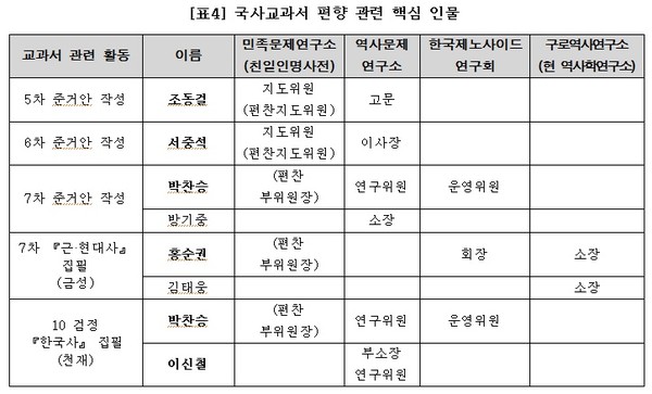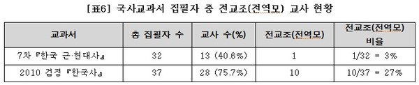 이러한 현상은 특히 현행 『한국사』교과서에서 두드러진다. 6차까지의 국정 국사교과서 집필자 가운데는 교사가 아예 없다. 7차 『한국 근·현대사』교과서만 하더라도 6종의 집필자 총 32명 가운데 전교조나 전역모 소속 교사는 금성출판사 『한국 근·현대사』 집필자인 이인석 한 명이었다. 그런데 『한국사』교과서 집필자 가운데는 전교조나 전역모 소속 교사가 자그마치 10명이나 된다. 『한국사』교과서 집필자 가운데 교사가 차지하는 비중이 『한국 근·현대사』교과서보다 두 배 가까이 커지긴 했지만, 그렇다 하더라도 『한국사』교과서 집필자 전체에서 전교조나 전역모 소속 교사가 차지하는 비중이 9배로 커졌다는 것은 주목해야 할 사실이다. 이는 시간이 가면서 훨씬 더 많은 전교조나 전역모 소속 교사가 적극적으로 국사교과서의 집필에 가담하고 있음을 뜻한다(아래의 분석 표 참조).