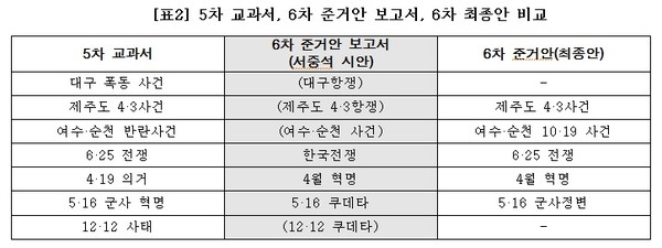 2. 6차 준거안(최종안)의 내용1994년 3월에 시작된 준거안파동은 교육부가 종래의 정통적 견해를 대폭 수용하는 최종 준거안을 마련했다면서 이를 11월에 발표함으로써 매듭지어졌다. 그러나 최종 준거안은 교육부 발표처럼 종래의 정통적 견해를 대폭 수용하는 내용이 결코 아니었다.용어문제로 처음부터 논란이 된 ‘대구항쟁’, ‘12·12쿠데타’가 준거안에서 아예 제외되고, ‘4·3항쟁’이 원래 5차 교과서의 용어인 ‘제주도 4·3사건’으로 돌아갔다. ‘6·25 전쟁’ 대신 서중석은 ‘한국전쟁’으로 부를 것을 주문했으나 최종 준거안에서는 원래 5차 교과서의 용어인 ‘6·25 전쟁’으로 돌아갔다.나머지 용어는 서중석의 시안 거의 그대로 최종안에서 확정되었다. 5차 교과서의 ‘4·19 의거’는 최종 준거안에서 ‘4월 혁명’으로 확정되었고, ‘5·16 군사 혁명’도 ‘혁명’이라는 단어가 빠지고 ‘5·16 군사정변’으로 확정되었다. 서중석이 제안한 용어인 ‘5·16쿠데타’는 ‘5·16 군사정변’과 매한가지다. 5차 교과서의 ‘여수·순천 반란사건’도 서중석의 제안대로 ‘반란’이라는 단어가 빠지고, ‘여수·순천 10·19 사건’으로 확정되었다. 결과적으로 한국 현대사 주요 사건의 용어가 서중석이 작성한 시안대로 상당 부분 바뀌게 되었던 것이다. 이를 표로 만들면 다음과 같다.