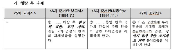통일민족국가의 건설을 당면 과제로 꼽고 있는 <6차 준거안>과 달리 <7차 준거안>은 통일민족국가 건설 외에도 ‘식민지 잔재 청산’, ‘토지제도 개혁’을 해방 후의 시대적 과제로 꼽고 있다. ‘친일파 청산’, ‘토지 개혁’은 서중석이 작성한 <6차 준거안 보고서>에서 제시한 내용으로 <6차 준거안(최종안)>에서는 배제되었다. 하지만 <7차 준거안>은 이를 다시 수용한 것이다.나. 신탁통치 문제
