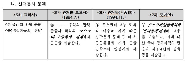 모스크바삼상회의의 ‘신탁통치’결정을 둘러싼 “좌우대립의 심화 등을 서술한다”는 <7차 준거안>의 내용은 모스크바 3상 회의의 내용을 “민족주의 입장에서 서술한다”는 <6차 준거안>의 모호한 구절과는 확연히 다르다. 이는 오히려 “우익의 반탁 운동과 좌익의 모스크바 3상회의 결정지지 운동을 서술한다”는 <6차 준거안 보고서>와 그 내용이 유사하다.다. 북한 정권 문제