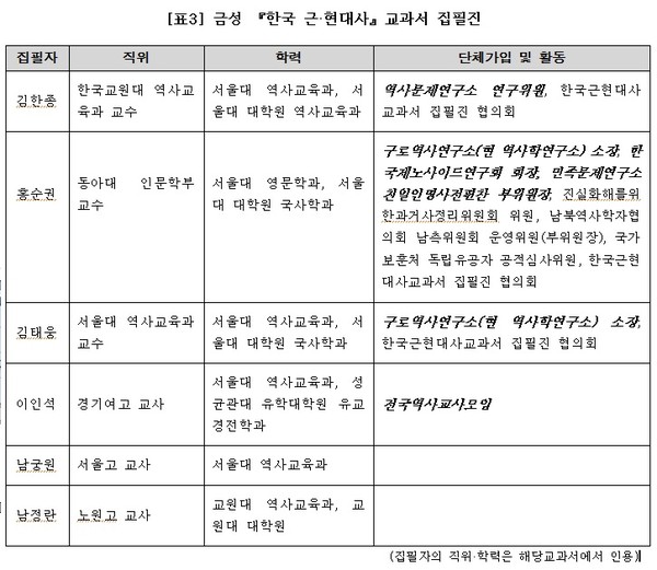 금성교과서의 집필자 여섯 사람 가운데 교수는 김한종, 홍순권, 김태웅의 셋이다. 이 가운데 홍순권과 김태웅은 둘 다 ‘민중사학’을 표방하는 단체 가운데서도 가장 급진적 성향을 보이는 것으로 평가되는 구로역사연구소(현 역사학연구소)의 소장을 역임했다. 금성교과서가 그토록 심한 좌편향 성향을 보이게 된 원인은 이처럼 집필진 가운데 구로역사연구소의 소장을 지낸 사람이 두 명이나 있다는 데서 찾을 수 있다. 김한종과 김태웅은 서울대 역사교육과 선후배 사이로, 김한종은 역사문제연구소의 연구위원으로도 활동하고 있다.금성교과서의 집필자 가운데 교사는 이인석, 남궁원, 남정란의 셋인데, 이 가운데 이인석과 남궁원은 위의 김태웅, 김한종과 더불어 서울대 역사교육과 동문이고, 남정란은 김한종이 교수로 재직하고 있는 교원대 졸업생이다. 교사 세 명 중 이인석은 전교조의 연계단체인 <전국역사교사모임> 소속이다.Ⅷ. 『한국사』교과서의 여전한 이념 편향성2011년부터 고등학교에서는 새로운 『한국사』교과서가 국사 교재로 쓰이고 있다. 교과서파동을 불러온 금성교과서를 비롯한 『한국 근·현대사』교과서의 편향성을 바로잡는 차원에서 2009년에 새 교육과정이 만들어지고, 그에 따라 2010년에 검정을 통과한 6종의 『한국사』교과서가 2011년부터 고등학교에서 교재로 사용되고 있다.이 새로운 『한국사』교과서는 얼핏 보면 7차 교육과정의 『한국 근·현대사』교과서보다는 일부 개선된 것으로 느껴지기도 한다.1. 『한국사』교과서의 6·25 전쟁에 대한 편향된 해석하지만 새 『한국사』교과서에서 편향성이 더 심해진 부분도 있다. 대표적인 것이 6·25 전쟁 중의 민간인 희생에 대한 서술이다.우리 국민이 겪은 6·25의 전쟁 피해 가운데 민간인의 희생으로 대표적인 것은 ‘인민재판’을 통한 처형과 ‘납북’이다. 하지만 최근의 국사교과서는 6·25 전쟁 중 민간인의 희생에 관해 서술하면서, ‘인민재판’, ‘납북’과 같이 대한민국의 전쟁 피해를 나타내는 용어의 사용을 꺼리고 있다. 대신에 남한과 북한 중 누가 피해자이고 누가 가해자인지를 알 수 없는 용어인 ‘학살’이라는 표현을 쓰고 있다. 남한이 북한의 남침에 의한 전쟁 피해자라는 사실을 희석시키고 있는 것이다. 금성 『한국 근·현대사』교과서의 경우, 6·25 전쟁 중 아군에 의해 이루어진 민간인 희생을 ‘학살’이라는 용어를 써서 부각시키면서도 적군에 의해 저질러진 만행에 대해서는 상대적으로 훨씬 적게 기술하고 있다. 교과서의 이러한 편향적 서술은 현행 『한국사』교과서에서는 더욱 심해졌다.2. 민중사학자들의 6·25 전쟁 해석, 연구목적 및 서술내용현행 『한국사』교과서 가운데 6·25 전쟁이 남침에 의한 것임을 기술하지 않는 교과서는 삼화와 천재인데, 이들 교과서는 바로 6·25 전쟁 중의 민간인 희생을 ‘학살’이라며 강조하는 교과서이기도 하다. 그러므로 『한국사』교과서 중 일부가 6·25 전쟁과 관련해서 7차 금성 『한국 근·현대사』교과서보다 더욱 편향된 서술을 하고 있는 것은 결코 우연이 아니다. 이는 다분히 의도된 것이다. 이른바 ‘민중사학자’들이 종래 대한민국의 건국을 둘러싼 해석을 자신들이 원하는 방향 쪽으로 바꾸는데 주력했다면, 최근에는 6·25 전쟁에 관한 역사해석의 방향을 바꾸고, 그것을 국사교과서에 기술하는데 주력하고 있기 때문이다. 이는 한국 현대사의 최대 사건인 6·25 전쟁을 어떻게 파악하느냐가 오늘날의 한국을 어떻게 이해하느냐, 그리고 앞으로의 한국이 어떻게 나아가야 하는가와 직결되는 문제이기 때문이다.가. 민중사학자들의 6·25 전쟁 해석(1) 6·25 전쟁의 용어와 해석 - “남북전쟁”은 “미국과 북(北)이 벌인 싸움”민중사학자들은 6·25 전쟁을 어떻게 해석하려 하는가? 먼저 6·25 전쟁을 어떻게 부르는지부터 살펴보자. 국사교과서의 공식 용어는 5차 이후 줄곧 ‘6·25 전쟁’이지만 1980년대 이후 민중사학자들은 6·25 전쟁을 ‘한국전쟁’이라고 불렀다. 이는 ‘6·25’라는 용어가 전쟁의 기원을 1950년 6월 25일의 무력충돌로 단순화시키고, 전쟁에 대한 논의를 전쟁책임론으로 환원시킨다는 이유에서 당시 소장학자들이 ‘한국전쟁’이라는 용어를 사용할 것을 제기했기 때문이다. 쉽게 말해 ‘6·25’라는 용어에는 6월 25일에 북한이 남침을 해서 전쟁을 일으켰다는 의미가 담겨 있으므로 쓰지 않기로 한 것이다.이처럼 ‘한국전쟁’이라는 용어는 ‘6·25 전쟁’이라는 용어보다 친북적이다. 그럼에도 이 친북적인 ‘한국전쟁’이라는 용어도 마다하고 ‘남북전쟁’으로 부르는 학자들도 있다. ‘남북전쟁’이라는 용어를 제일 먼저 쓴 것은 ‘내재적 발전론’의 주창자인 김용섭으로 알려져 있다. 연세대 사학과 명예교수인 김용섭에 이어 그의 제자인 김성보도 역시 ‘남북전쟁’이라는 용어를 쓰고 있다. 김성보와 함께 오랫동안 역사문제연구소에서 활동해 온 이신철도 6·25 전쟁을 ‘6·25 남북전쟁’으로 부른다. 이신철은 2000년에 이미 남북의 두 국가와 두 정부를 인정해야 한다면서 북한을 ‘조선민주주의 인민공화국’으로, 6·25 전쟁을 