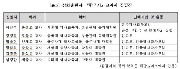 3. 『한국사』교과서의 집필진2009년에는 편향된 교과서를 바로잡겠다는 목적으로 새 교육과정이 만들어졌다. 이 ‘2009 개정 교육과정’에서 기존의 국사 과목은 『한국사』로 과목명이 변경되었다. 그에 따라 2010년 검정을 거쳐 『한국사』교과서 6종이 최종 선정되어 2011년부터 고등학교에서 교재로 사용되고 있다. 하지만 일부 『한국사』교과서는 『한국 근·현대사』교과서보다 그 편향성이 더욱 심해졌다는 평가를 받는다. 이는 7차 교육과정 때보다 훨씬 더 많은 민중사학자들과 전교조 및 전역모 교사들이 문제의 『한국사』교과서에 집필진으로 참여했기 때문이다.현행 『한국사』교과서 가운데 삼화교과서를 예로 들어 설명해보자. 삼화교과서는 천재교과서나 미래엔교과서 못지않게 편향된 서술을 하고 있는 교과서이다. 삼화는 『한국사』 6종 가운데 유일하게 5·10총선거를 여전히 ‘남한만의 총선거’로 평가하고 있는 교과서이다. 또한 삼화는 6·25 전쟁이 남침에 의한 것임을 기술하지 않는 『한국사』교과서 2종 가운데 하나이다(삼화, 천재). 삼화는 6·25 전쟁 중의 민간인 희생을 ‘학살’이라며 강조하는 『한국사』교과서 3종(천재, 삼화, 미래엔) 가운데 하나로, 전쟁 중의 민간인 희생을 아예 “민간인 학살 사건”이라는 표현을 써서 상세하게 서술하고 있다.삼화 『한국사』교과서의 집필진 6명은 전원 고등학교 교사인데, 이 가운데 5명이 전교조와 전국역사교사모임(전역모) 회원이다. 특히 이인석은 전교조의 연계 단체인 전국역사교사모임 소속으로, 교과서파동을 불러온 금성출판사 『한국 근·현대사』를 집필하기도 했다. 이는 오늘날과 같은 편향된 국사교과서의 출현이 민중사학 관련 단체에서 활동한 민중사학자들에 의해서만이 아니라 전교조와 전역모 교사들에 의해서도 이루어졌다는 것을 보여준다.