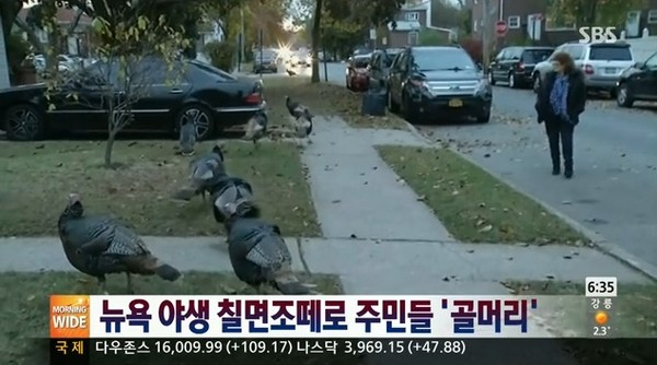뉴욕이 칠면조에게 습격을 당해 화제다.23일 외신들에 따르면 미국 뉴욕시에서는 최근 칠면조가 도시를 습격하고 있어 칠면조 퇴치를 놓고 시민들과 도시 관계자들이 골머리를 앓고 있는 것으로 알려졌다.칠면조가 밤낮없이 울어대며 발생하는 소음 공해 뿐만 아니라 배설물과 깃털 등을 잔뜩 남기고 다녀 뉴욕 시민들의 불편이 높아졌다는 전언이다.이 뿐만 아니라 뉴욕 시민들은 길에서는 물론 집 앞에서도 야생 칠면조의 습격을 당하고 있다.뉴욕시 자치구인 스탠튼 아일랜드에서는 야생 칠면조가 길거리를 활보하며 교통을 방해하고 사고 위험을 유발하는데다, 심지어 아이들이 들고 다니는 과자를 빼앗아먹는 등 각종 문제를 야기하고 있다고 전해졌다.이는 지난 2011년부터 발생한 문제라고.추수감사절 칠면조 통구이를 먹는 미국 전통문화 특성상 칠면조 개체수는 조금씩 감소해왔다.그러나 근래들어 야생 칠면조에 대한 보호 노력이 시작되면서 미국 내 야생 칠면조 개체수는 700만마리에 이르는 것으로 조사됐다.한편, 뉴욕 칠면조의 습격 소식을 접한 네티즌들은 "칠면조 때문에 고생이네" "칠면조 구이 맛있나?" "같이 살 수 있는 방안 강구해야겠다" "잘 관리해야겠다" 등의 반응을 보였다.[사진 출처=SBS 생방송 모닝와이드 캡처]