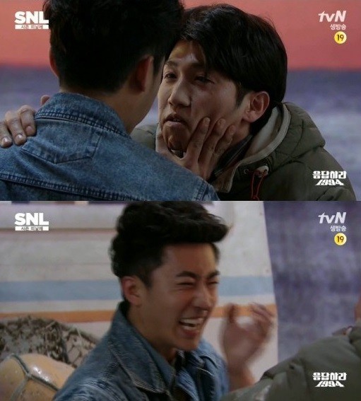 손호준이 유세윤과 뽀뽀해 화제다.23일 방송된 tvN 'SNL 코리아' 정규시즌 마지막회는 크루 스페셜로 꾸며진 가운데 배우 손호준과 두산 베어스의 김현수 선수가 출연했다.이날 유세윤은 '응답하라 1994'의 명장면 삼천포(김성균)-윤진이(도희) 키스신 장면을 패러디 해 눈길을 끌었다.유세윤은 클라라, 안영미 등 여성들을 배로 불러 "너 소원 빌었냐. 나는 첫키스하게 해달라고 빌었다. 그런데 들어주셨다"며 수차례 키스를 반복해 시청자들의 웃음보를 자극했다.마지막으로 배에 올라탄 이는 '응답하라 1994'에서 해태로 출연 중인 손호준. 유세윤은 손호준에게도 "첫키스하게 해달라고 빌었다"고 말했고, 이어 손호준을 애틋하게 바라봤다.이에 손호준은 "돌이킬 수 없는 실수는 하지 마라"고 말하더니 유세윤 입에 빠르게 입맞춤한 뒤 민망한 듯 웃음을 터트려 스튜디오를 폭소케 했다.한편, 손호준-유세윤 뽀뽀 소식을 접한 네티즌들은 "손호준 너무 멋있다" "유노윤호 많이 닮은듯" "손호준 잘됐으면" "아 요즘 저렇게 매력 넘치는 사람도 없다" "손호준 파이팅" "웃는거 진짜 호탕하더라" 등의 반응을 보였다.[사진 출처=tvN 'SNL 코리아' 방송화면 캡처]