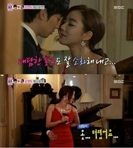 웨딩촬영 중 이소연의 드레스가 터지는 사고가 발생했다.23일 방송된 MBC '우리 결혼했어요(이하 우결)'에는 윤한과 이소연의 웨딩촬영 2편이 전파를 탔다.이날 윤한과 이소연은 그들이 원했던 콘셉트인 '물랑루즈'를 연상케 하는 섹시한 복장을 하고 웨딩촬영에 임했다.이소연은 몸매가 여실히 드러나는 붉은색 드레스를 입었고, 윤한은 블랙 컬러의 턱시도를 입은 채 서로를 강렬히 바라보며 영화 속 한 장면 같은 모습을 연출했다.윤한과의 촬영이 긴장돼 연신 웃음을 터트리던 이소연은 촬영 소품으로 이용됐던 와인을 마시고 나서야 촬영에 몰입할 수 있었다.이소연은 피아노 위에 앉아 윤한의 옷깃을 잡아 당기거나 그의 품에 안겨 그를 바라보며 섹시한 표정을 지으며 윤한을 유혹했다. 윤한 역시 그런 이소연을 바라보며 사랑에 빠진 남자로 완벽히 분해 시청자들을 설레이게 만들었다.그렇게 촬영을 잘 이어나가던 중 이소연은 결국 윤한의 모습에 웃음을 터트렸고, 이소연의 드레스가 찢어지는 사고가 발생했다. 이소연은 연신 웃으며 "옷 터졌어요"라고 고백했고, 결국 웨딩 촬영이 잠시 중단됐다.이소연은 개인 인터뷰에서 "나는 살다살다 드레스가 찢어진 건 처음이다. 나 그런거 잘 한다. 근데 이 남자가 신경 쓰이니까 뭔가가 잘 안됐다. 이소연 대 전윤한으로 만난 게 아니라 우리가 어떤 설정한 상황에 맞게 연기하는 게 재밌었다"고 말해 눈길을 끌었다.[사진 출처=MBC 우리결혼했어요 방송화면 캡처]