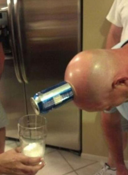 공개된 사진에는 한 민머리 남성이 캔을 머리에 밀찬시킨 채 컵에 음료를 따르는 모습이 담겨 있다. 이 남성은 머리를 숙여 음료를 따르고 있음에도 머리에 접착제로 고정시켜 놓은 듯 떨어지지 않아 웃음을 자아낸다.