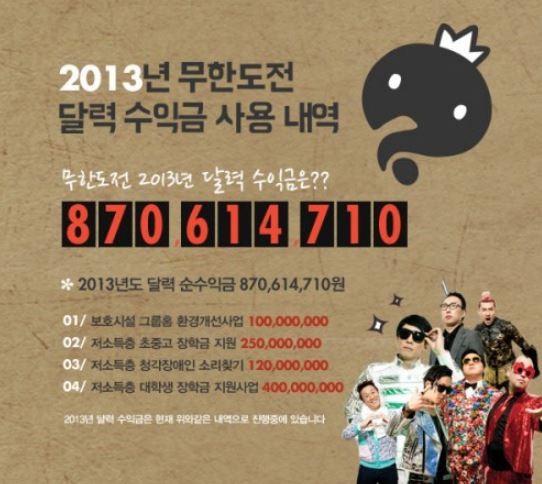 이날 공개된 무도달력 수익금은 8억7,061만4,710원으로 이는 지금까지 달력 수익 중 가장 높은 금액이다.