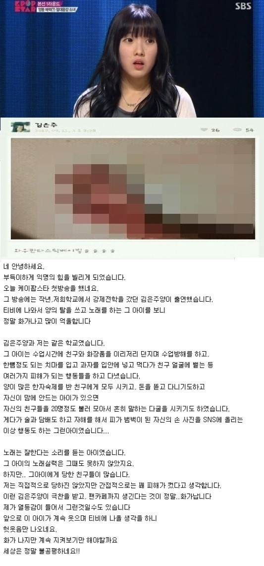 익명을 요구한 이 동창생은 “K팝스타 김은주 정말 화가 난다”라며 “티비에 나와서 양의 탈을 쓰고 노래를 하는 김은주 양을 보니 정말 화가 나고 억울하다. 원래 노래는 잘 했다. 김은주는 지난해 우리 학교에서 강제 전학을 갔다”고 주장했다.