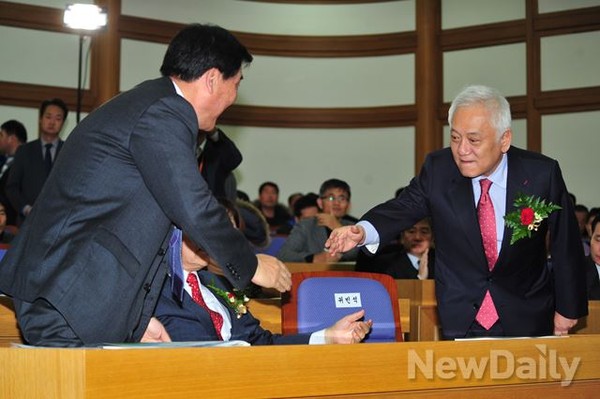 [포토]인사 나누는 민주당 '박기춘-김한길' 의원
