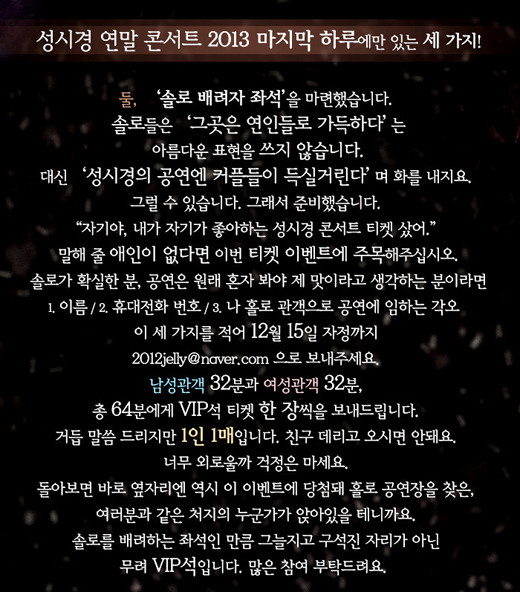 가수 성시경이 연말 콘서트에서 솔로좌석 특별 이벤트를 준비했다.성시경은 12월 30일과 31일 올림픽공원 내 체조경기장에서 [2013 마지막 하루]를 개최하고 팬들과 만난다.