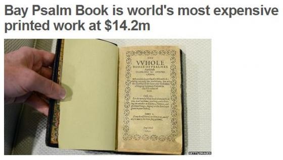 17세기 청교도 정착민들이 만든 미국 최초의 인쇄 도서 [베이 시편집]이 무려 150억에 팔렸다.26일(현지시간) 미국 뉴욕의 소더비 경매에서 600만 달러로 시작한 [베이 시편집]은 경매 5분 만에 투자회사 칼라일그룹의 공동 창업자인 데이비드 루벤스타인에게 1416만5000달러(약 150억 3190만원)에 낙찰됐다.