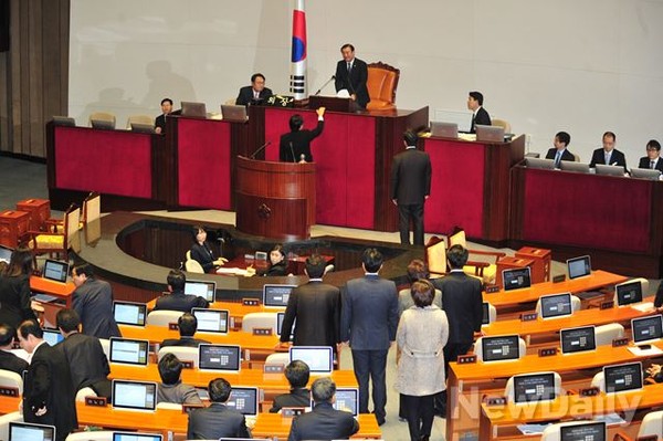 <민주당> 의원들이28일 오후 여의도 국회에서 열린 본회의에서 <황찬현> 감사원장 후보자 임명동의안을 상정한 <강창희> 국회의장에게 항의하고 있다.