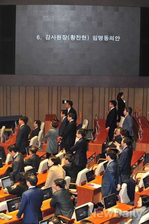 <전병헌> 민주당 원내대표가 28일 오후 여의도 국회에서 열린 본회의에서 <황찬현> 감사원장 후보자 임명동의안을 상정한 <강창희> 국회의장에게 항의하고 있다.