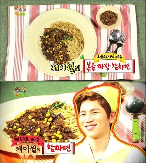 이날 [야간매점] 코너에서 케이윌은 짜장참치 캔을 이용한 [참짜면]을 선보였다. 케이윌 참짜면은 달궈진 프라이팬에 기름을 살짝 두르고 팬에 짜장참치를 넣고 볶다가 캔 옥수수와 삶은 소면을 넣으면 완성된다.