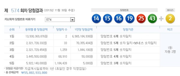 2013년 11월 30일 실시된 제574회 나눔로또 1등 당첨번호는 ‘14, 15, 16, 19, 25, 43’이며, 2등 보너스 번호는 2번이다.