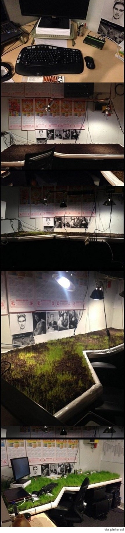 공개된 사진에는 평범했던 업무용 책상이 잔디밭 책상으로 변화는 과정이 담겨 있다. 직장 동료가 약 3주 동안 휴가를 떠난 사이 그의 동료는 책상 위에 흙을 덮고 잔디 씨를 뿌리고 싹을 틔우기 위한 조명을 달아 친환경 잔디밭 책상을 만들었다.