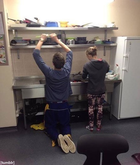 공개된 사진에는 설거지를 하고 있는 여성과 씻은 그릇을 정리하고 있는 남성의 모습이 담겨 있다. 그런데 여자는 서서 설거지를 하고 있고, 남자는 무릎을 꿇은 자세임에도 여성의 키와 비슷해 눈길을 끈다.