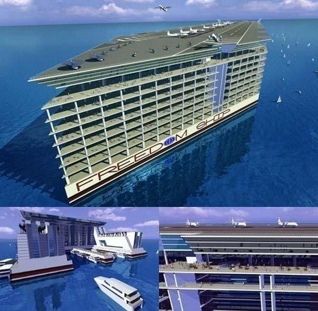 [현대판 노아의 방주]라 불리는 이 배의 이름은 [프리덤 쉽](Freedom Ship)이다. 학교, 병원, 공원, 쇼핑센터, 카지노는 물론 자체적으로 공항까지 갖추고 있으며 길이 1.4km, 폭 228미터를 자랑한다.
