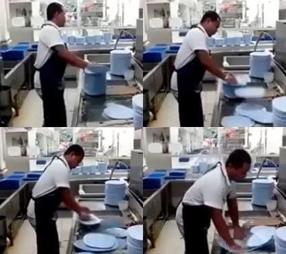 공개된 영상에는 검은색 앞치마를 두르고 있는 한 남성이 주방에서 수북하게 쌓여 있는 접시들을 빠른 속도로 닦는 모습이 담겨 있다.