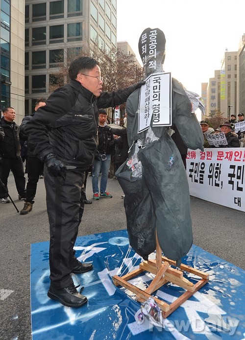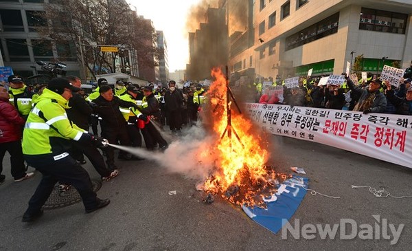 문재인의원 인형에 불을 붙여 화형식을 진행했다. -